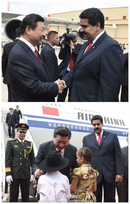 ????新華網(wǎng)北京7月21日電 據(jù)新華社“新國際”微博報(bào)道,經(jīng)過近7小時(shí)飛行,習(xí)近平主席當(dāng)?shù)貢r(shí)間20日下午飛抵加拉加斯。專機(jī)進(jìn)入委領(lǐng)空后,委空軍2架蘇-30戰(zhàn)機(jī)升空護(hù)航。馬杜羅總統(tǒng)親自到機(jī)場迎接。隨后,歡迎儀式在機(jī)場隆重舉行,習(xí)近平在馬杜羅陪同下檢閱儀仗隊(duì)。