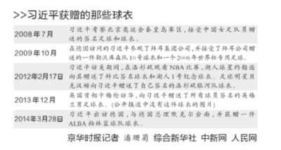 ????作為足球迷,能夠收獲著名球隊(duì)、球員的足球和球衣,恐怕是最讓別人羨慕的事兒了。習(xí)近平就曾經(jīng)收到球星貝克漢姆簽名的球衣、德甲勒沃庫(kù)森隊(duì)球衣、2006年世界杯專用足球等,也包括中國(guó)女子足球隊(duì)隊(duì)員簽名的足球。
