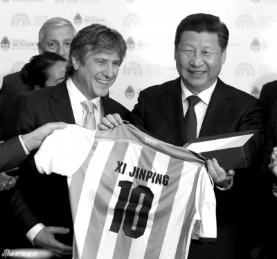 ????在和阿根廷副總統(tǒng)兼參議長(zhǎng)布杜及眾議長(zhǎng)多明格斯舉行會(huì)談時(shí),習(xí)近平特別提到阿根廷足球隊(duì)在世界杯奪得亞軍,他說(shuō):“剛才眾議長(zhǎng)先生問(wèn)我是否喜歡足球,我說(shuō)我非常喜歡足球。他也祝愿中國(guó)能夠早日舉辦一屆世界杯,這正是我的愿望。但是我們足球的發(fā)展,還希望同阿根廷加強(qiáng)交流合作,靠你們的幫助,提高我們的水平。”