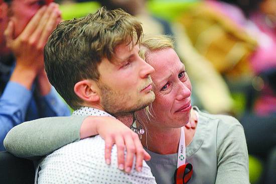 7月20日,在澳大利亞墨爾本,兩名與會代表在大會開幕式上相擁而泣。當日,第20屆國際艾滋病大會在澳大利亞第二大城市墨爾本開幕,一萬多名與會者在開幕式上集體悼念6名在馬航MH17航班墜毀事件中遇難的抗艾專家。新華社記者 徐儼儼攝