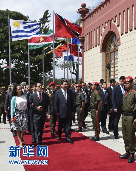 ????習(xí)近平抵達(dá)時,委內(nèi)瑞拉副總統(tǒng)阿雷亞薩和夫人、查韋斯女兒羅莎率政府部長和三軍高級將領(lǐng)迎接。