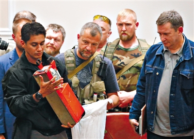 22日,烏克蘭頓涅茨克,烏克蘭民間武裝將MH17的兩個(gè)黑匣子移交給馬方調(diào)查組。馬方調(diào)查人員稱,黑匣子“只有輕微損傷,基本完整無(wú)缺”。