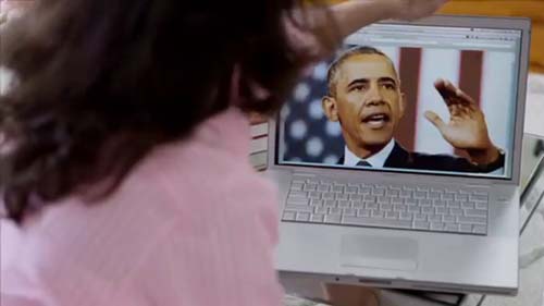 ????剎那間,鏡頭切換到女子的筆記本電腦上:美國總統奧巴馬的頭像鋪滿了全屏。