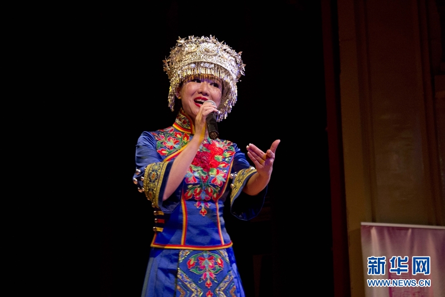 來(lái)自中南民族大學(xué)的演員在臺(tái)上表演。新華網(wǎng)發(fā) Xesco攝