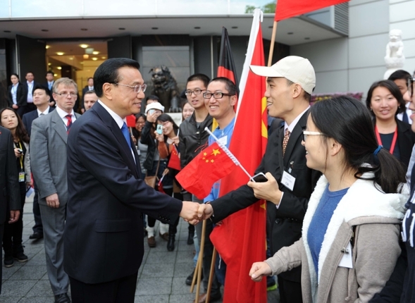 使館主樓外,還有不少中國留學生。他們打著“歡迎總理訪德”的橫幅,揮舞著中德兩國的國旗。見到克強總理走來,他們一下子圍了上去,爭相與克強總理握手。