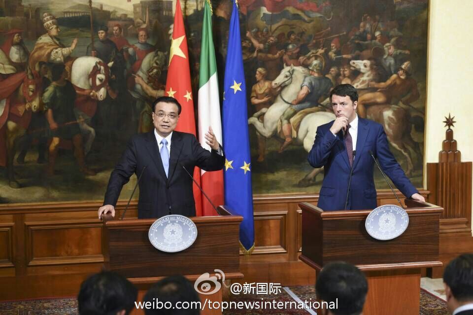 ??? 新華網北京10月15日電 據新華社“新國際”微博報道,國務院總理李克強14日與意大利總理倫齊在意總理府共同會見記者。李克強說,很高興來到不是一天建成的羅馬,中方不追求對意貿易順差,對擴大中意貿易合作規模充滿信心,愿與意方繼續深挖務實合作。即將簽署的協議規模高達80億歐元,這說明貿易投資規模還會擴大。?
