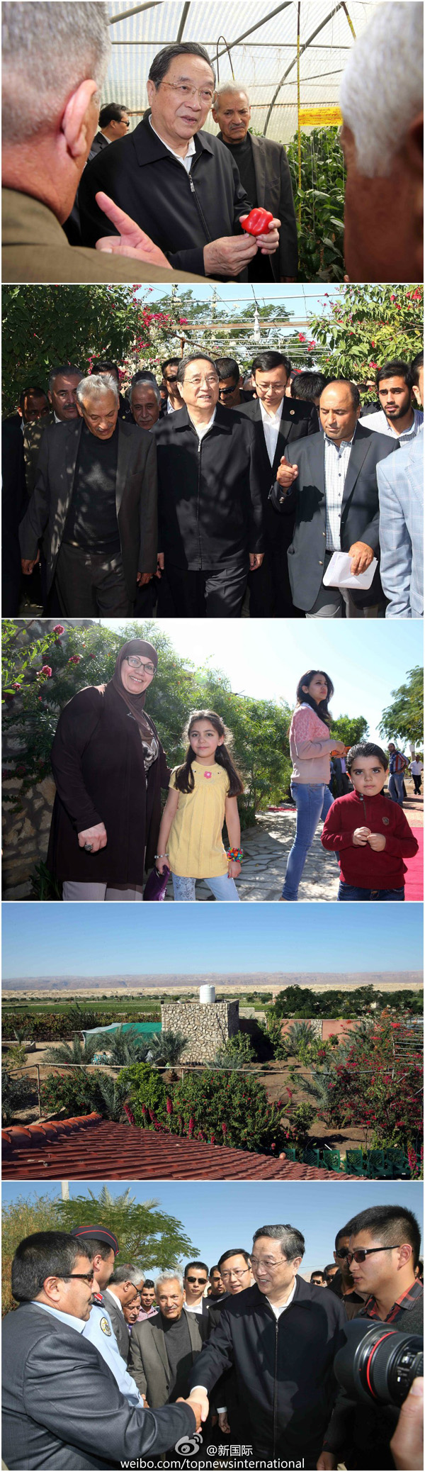 ????新華網北京11月8日電 據新華社“新國際”微博報道,全國政協主席俞正聲8日驅車100多公里,前往約旦河谷南段的碩果農業合作社參觀。他走進農家和田間大棚,詳細了解蔬菜產銷情況,與約旦農民共話友誼。俞正聲說:“約旦人民是我們的好朋友。朋友過得好,我們表示祝賀,希望你們家園更美麗。”