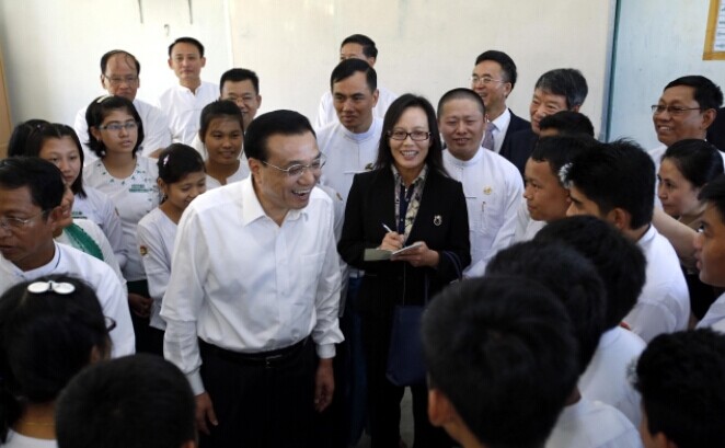 14日一早,克強總理來到內比都第十四中學。這是一所普通的緬甸公立學校,課程從小學一直到高中。