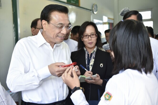 11月14日,內比都第十四中學學生將自己手工制作的中國結贈送給李克強總理。