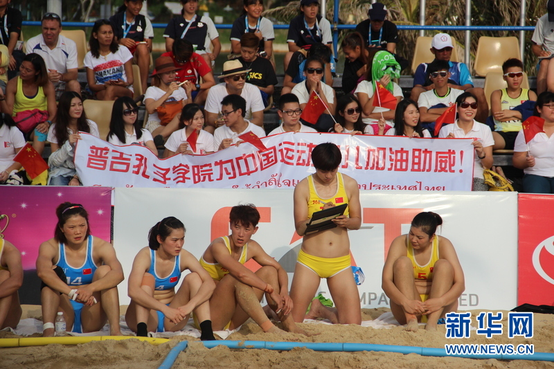 ??? 11月16日,中國沙灘手球運動員們比賽中場休息。中國體育代表團16日在泰國普吉舉行的第四屆亞洲沙灘運動會上勇奪2枚金牌和2枚銅牌。當天比賽全部結束時,中國隊以3金2銀5銅的成績暫列獎牌榜第五。新華社發(塔納攝)