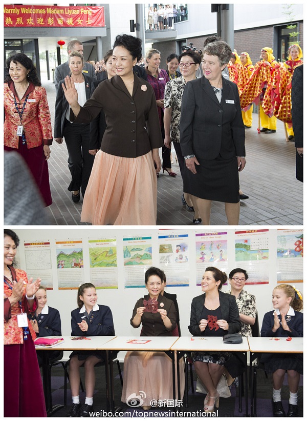 ??? 新華網(wǎng)北京11月19日電 據(jù)新華社“新國際”微博報道,習(xí)近平主席夫人彭麗媛19日在悉尼參觀育文武女子學(xué)校,在舞龍隊引導(dǎo)下來到孔子課堂。“白日依山盡……”16名女孩朗誦《登鸛雀樓》,還學(xué)打中國結(jié)、制作剪紙、繡織漢字“中澳友誼長存”。彭麗媛拿起剪刀,剪出一個“?!弊?。?