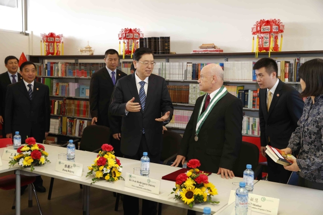 ??? 校長羅德里格斯向張德江介紹了這所孔子學院成立4年多來的發(fā)展情況,并向張德江贈書。