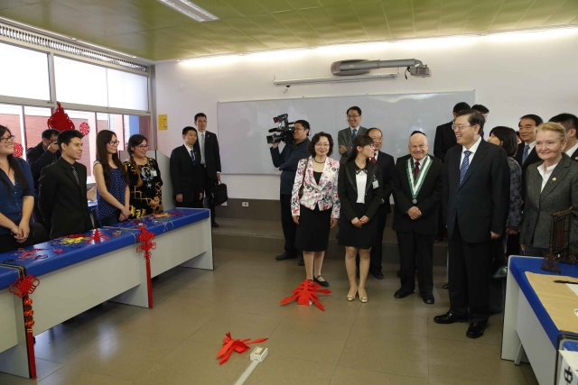 ??? 22日,全國人大常委會委員長張德江參觀秘魯里卡多·帕爾瑪大學孔子學院,與在這里學習中文的秘魯學生交流。