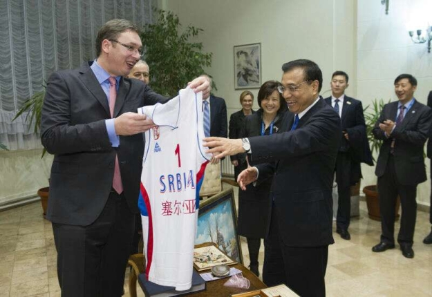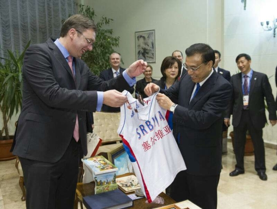 ????新華網北京12月18日電 據新華社“新華國際客戶端”報道,17日晚,李克強總理收到了一件特別的禮物:塞爾維亞國家籃球隊的1號球衣。武契奇總理贈送的這件白色球衣上特別寫上了李克強名字的中英文。