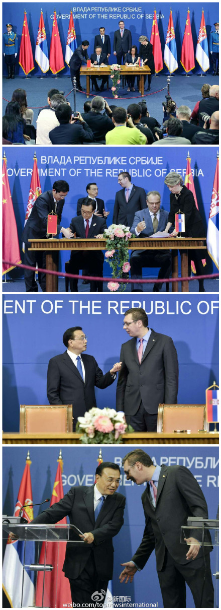 ????新華網北京12月18日電,據新華社“新國際”微博報道,李克強總理17日與塞爾維亞總理武契奇舉行會談。他說,希望中塞雙方密切人文交流,擴大教育、文化、旅游合作,望塞方為中國游客提供更多簽證便利。會談后,兩國總理共同見證了雙方經濟技術、能源、金融、航空、文化等領域合作文件的簽署。