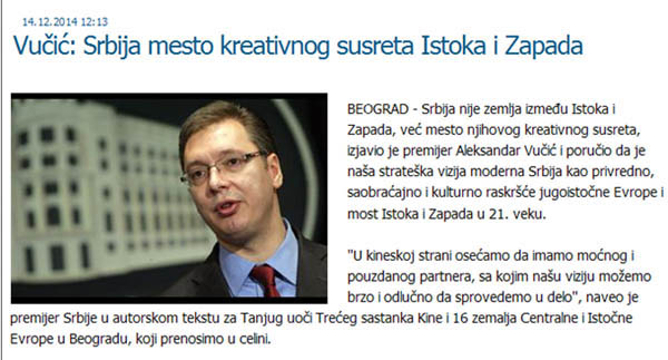 塞爾維亞總理武契奇14日在塞爾維亞南通社發(fā)表題為《塞爾維亞是東西方創(chuàng)造性相遇的地方》的署名文章。文章稱,塞爾維亞不是夾在東西方之間的國家,而是東西方創(chuàng)造性相遇的地方。他表示,一個現(xiàn)代化的塞爾維亞(應)成為東部歐洲經濟、交通、文化的交叉點以及21世紀東西方的橋梁。他說,中國是強大的和值得信賴的伙伴,通過同中國的合作,塞爾維亞可以很快、堅定地去實施自己的戰(zhàn)略預想。武契奇還引用《孫子兵法》作者孫武的話“如果你善于利用機會,機會會增加”,表示賽爾維亞將緊緊抓住現(xiàn)在的機遇,為自己的發(fā)展創(chuàng)造新的機會。
