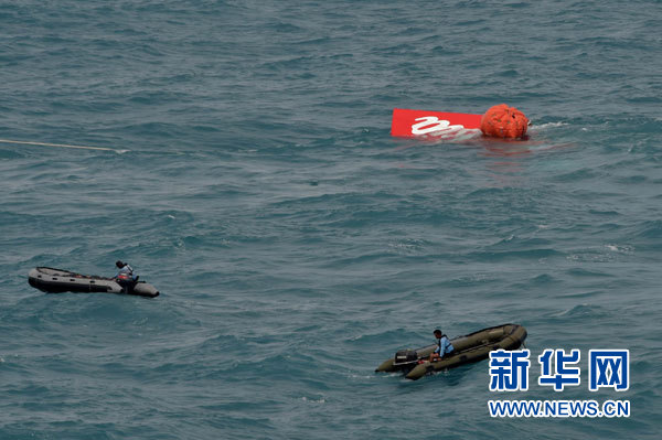 ??? 1月10日,工作人員駕駛橡皮艇協(xié)助打撈亞航失事客機(jī)的機(jī)尾殘骸。 據(jù)報(bào)道,搜救人員當(dāng)日已將亞航失事客機(jī)的機(jī)尾殘骸撈出海面。 新華社發(fā)