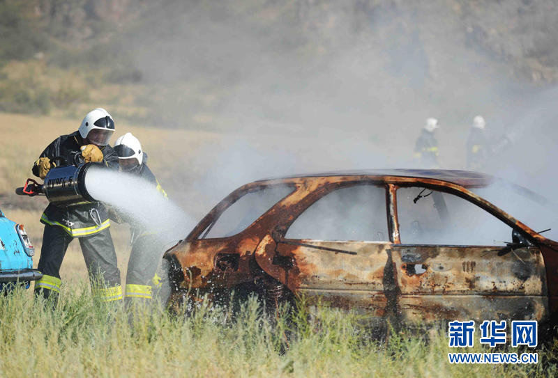 6月3日,代表中國參加上合組織國際救援聯合演練的新疆消防總隊隊員在哈薩克斯坦阿拉木圖州塔姆卡壘塔斯景區的哈內務部緊急情況委員會教練基地“巖石城-阿斯塔納”參加演練。新華社記者沙達提攝