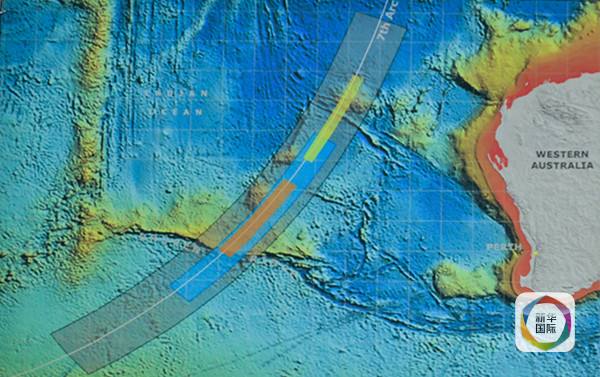 6月26日,澳方宣布,根據(jù)多國(guó)衛(wèi)星專家小組對(duì)已有衛(wèi)星信息進(jìn)行的重新分析,MH370航班的搜尋將轉(zhuǎn)入新區(qū)域,新搜索區(qū)域位于“藍(lán)鰭金槍魚(yú)”此前搜索區(qū)域以南,距離西澳大利亞海岸約1800公里,面積約6萬(wàn)平方公里,仍在根據(jù)衛(wèi)星與飛機(jī)“握手”信息而確定的第七條弧線上。圖為澳方公布的新區(qū)域,橙色區(qū)域是優(yōu)先級(jí)最高的搜尋區(qū),藍(lán)色區(qū)次之。(新華社記者徐海靜攝)