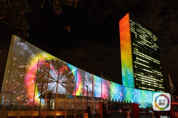↑9月22日,聯合國總部大樓外投影顯示可持續發展目標宣傳畫面。(新華社記者李木子攝)
