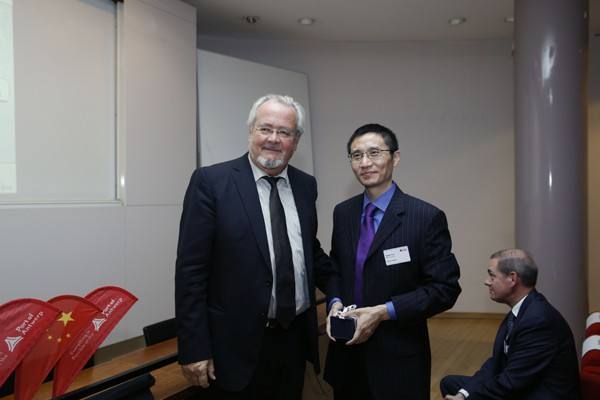↑安特衛普港務局主席Marc van Peel向出席活動的中國駐比利時大使館商務參贊郭建軍合影。