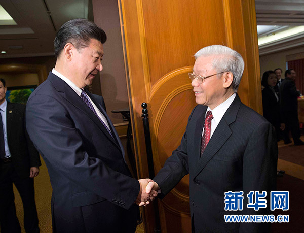 習近平向阮富仲介紹了中國共產黨黨建工作和中共十八屆五中全會提出的“十三五”時期中國經濟社會發展目標和理念。習近平指出,中越都重視黨建工作,兩黨建設面臨很多相似課題。我們愿同越方加強治黨治國經驗交流,共同提高執政能力。中越是具有戰略意義的命運共同體,兩國社會主義事業的前途命運息息相關。鞏固中越傳統友好關系,加強中越全面戰略合作伙伴關系,符合兩國共同利益。我們要繼續加強合作,堅持互利共贏,為鞏固發展兩國社會主義制度、推進社會主義事業發展作出重要貢獻。中越要深化傳統友誼,廣泛加強文化交流,加深兩國人民相互理解,使中越友好更加深入人心。