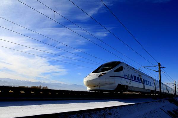 圖為2014年 12月13日,一列測(cè)試動(dòng)車(chē)在蘭新高鐵甘肅段疾馳 蔡增樂(lè)攝