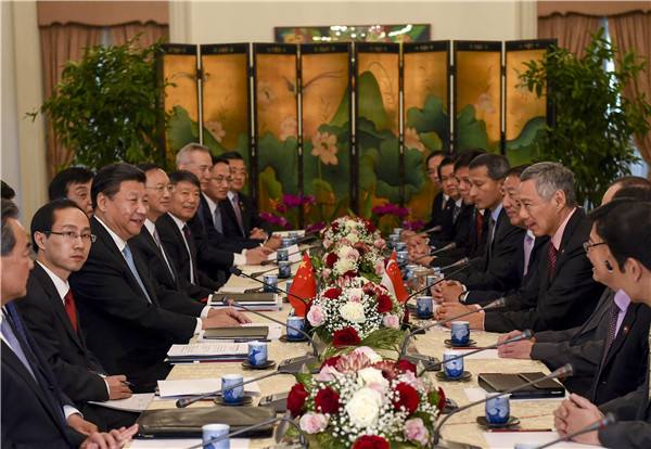 圖為2015年11月7日,習(xí)近平會(huì)見(jiàn)新加坡總理李顯龍。(李學(xué)仁攝)