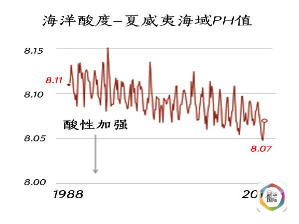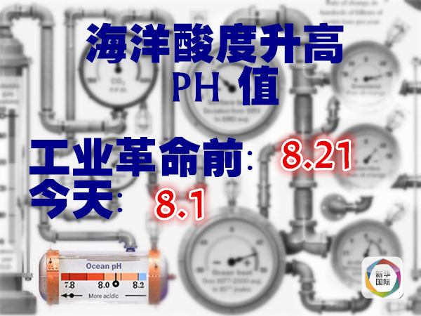 美國國家海洋和大氣管理局數據顯示,海洋平均pH值已經從工業革命之前的8.21,變為如今的不到8.1。這一數值變化表明,海水的酸度升高了大約30%。