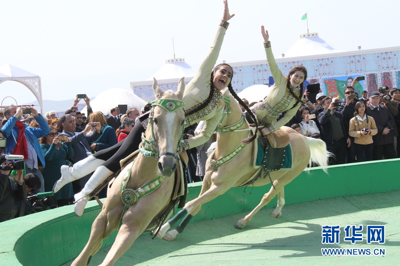 3月21日,在土庫曼斯坦首都阿什哈巴德,演員們表演汗血馬馬術。新華社記者盧敬利 攝
