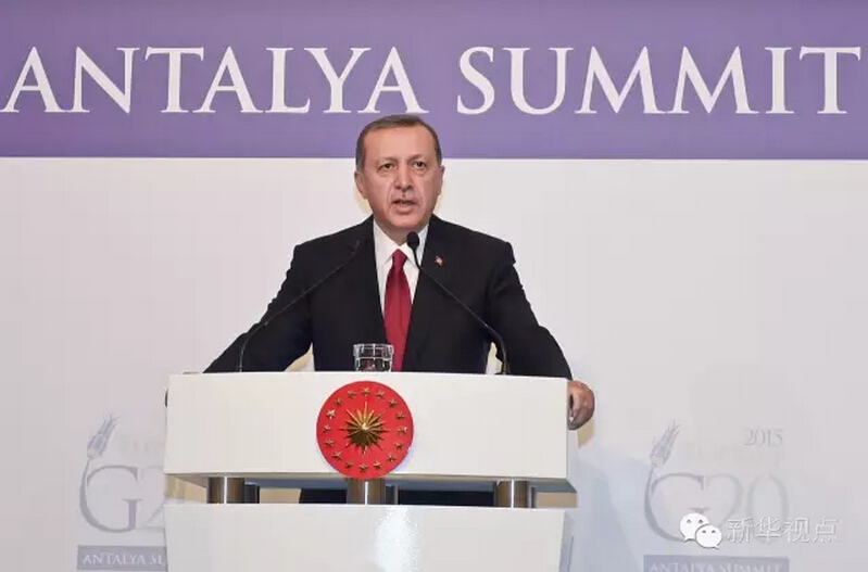 ??? 2015年11月,G20峰會在土耳其安塔利亞舉行,從安塔利亞到杭州,從地中海岸到錢塘江畔,與東道主接力棒一樣順利傳遞的,是對推動全球經濟穩步復蘇、實現可持續增長的決心。“接棒”后的中國,在議題設置上既汲取了安塔利亞峰會的智慧成果,又著眼當前、旨在長遠、彰顯新意。 2015年G20安塔利亞峰會上的埃爾多安總統↓