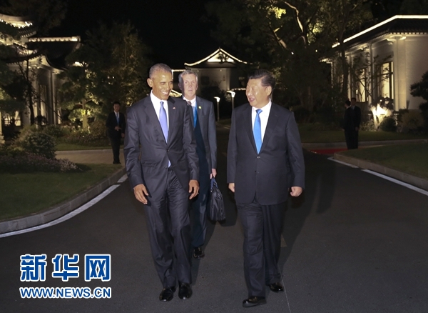 9月3日晚,國(guó)家主席習(xí)近平在杭州西湖國(guó)賓館與前來出席二十國(guó)集團(tuán)領(lǐng)導(dǎo)人杭州峰會(huì)的美國(guó)總統(tǒng)奧巴馬交談。 新華社記者 蘭紅光 攝