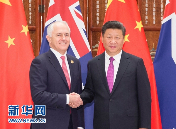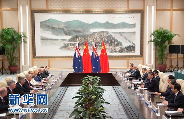 習近平指出,中方高度重視發展中澳關系。希望雙方相向而行,堅持互信互利原則,拓展務實合作,擴大人文交流,推動中澳全面戰略伙伴關系健康穩定向前發展。互信是保證中澳關系順利發展的前提。中澳要尊重彼此對發展道路的選擇,尊重彼此核心利益和重大關切。我們要加強優勢互補,繼續實施好中澳自由貿易協定,加快推進中方“一帶一路”倡議同澳方“北部大開發”計劃對接,積極拓展能源資源、農牧業、食品加工、基礎設施建設等領域合作,更好實現互利雙贏。希望澳方繼續致力于為外資提供公平、透明、可預期的政策環境,這也符合澳方自身利益。要深入推進創新發展戰略對接,擴大食品、農業、礦業、海洋科學等領域聯合研發。要深化教育、文化、旅游等領域交流,增進兩國人民相互了解和友誼。要加強反腐敗追逃追贓和反恐合作。中方愿同澳方加強在聯合國、二十國集團、亞太經合組織、東亞峰會等機制中的協調和合作。