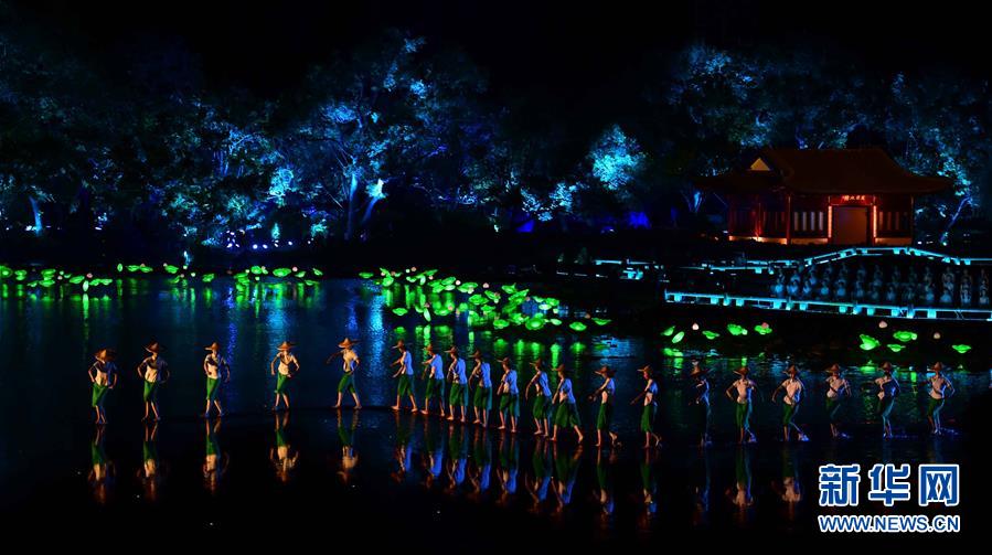 9月4日,演員在表演《采茶舞曲》。當日,出席二十國集團領導人杭州峰會的G20成員和嘉賓國領導人及有關國際組織負責人在杭州西湖景區(qū)觀看《最憶是杭州》實景演出交響音樂會。新華社記者 張鐸 攝