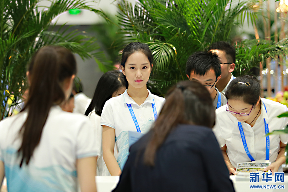 ????“小青荷”是此次峰會志愿者的代名詞。這個名字取自宋代詩人楊萬里描寫杭州的詩句“接天蓮葉無窮碧,映日荷花別樣紅”,“青荷”也音同“親和”,他們成了G20杭州峰會新聞中心里一道亮麗的風(fēng)景。新華網(wǎng) 祝立銘 攝