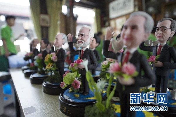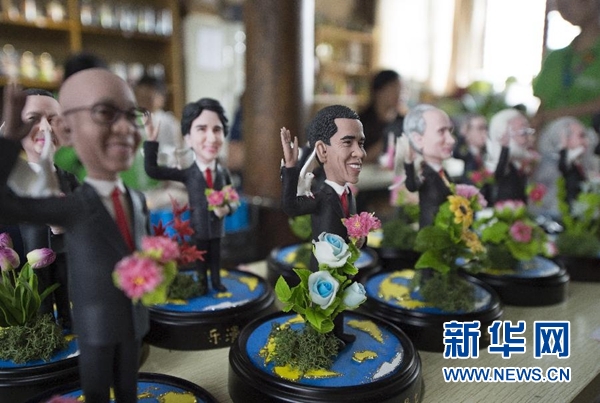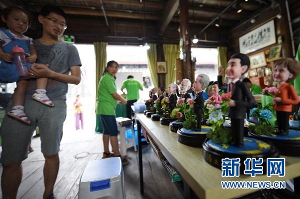 9月1日,手工藝人吳小莉創作的捏塑作品G20杭州峰會參會領導人形象在杭州京杭大運河畔的橋西歷史街區擺放展示。新華社記者 鞠煥宗 攝