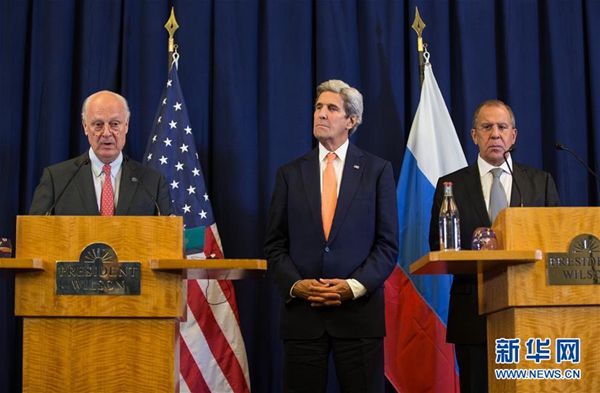 9月10日,在瑞士日內瓦,美國國務卿克里(中)、俄羅斯外長拉夫羅夫(右)和聯合國秘書長敘利亞問題特使德米斯圖拉出席聯合記者會。美國國務卿克里和俄羅斯外長拉夫羅夫10日凌晨在日內瓦就敘利亞停火協議達成一致,新的停火協議將于下周生效。 新華社記者 徐金泉 攝