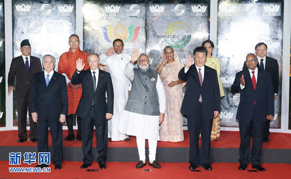10月16日,金磚國家領導人同“環孟加拉灣多領域經濟技術合作倡議”成員國領導人對話會在印度果阿舉行。國家主席習近平同印度總理莫迪、南非總統祖馬、巴西總統特梅爾、俄羅斯總統普京以及斯里蘭卡總統西里塞納、孟加拉國總理哈西娜、不丹首相托杰、尼泊爾總理普拉昌達、緬甸國務資政昂山素季、泰國政府代表等共同出席。這是與會領導人合影。新華社記者姚大偉攝