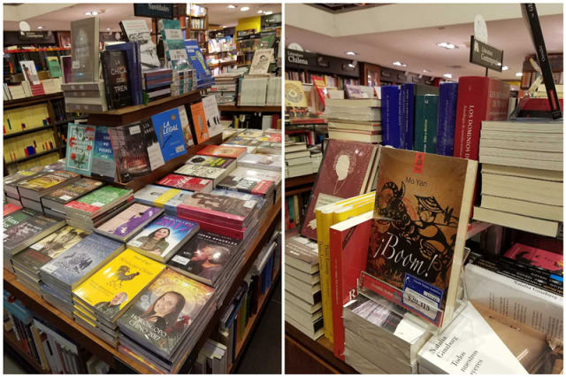 圖為中國(guó)著名作家莫言的小說(shuō)《爆炸》西文版在圣地亞哥一家書(shū)店銷(xiāo)售。(新華社記者劉華攝)