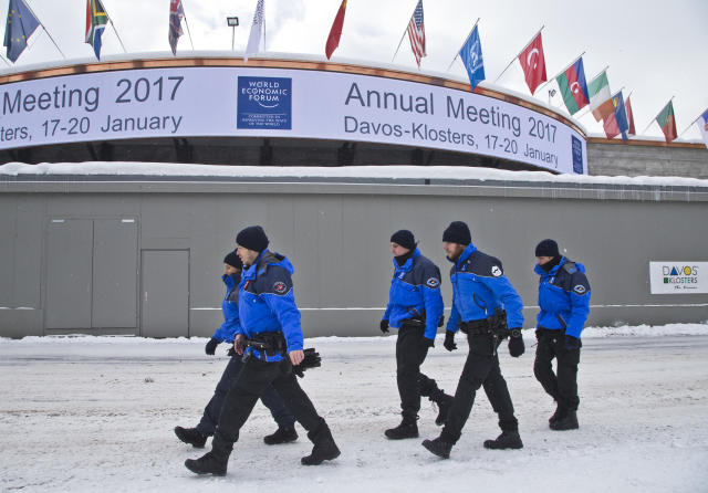 1月15日,在瑞士達沃斯,警察走過即將舉辦世界經濟論壇年會的會議中心。(新華/美聯)