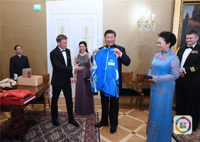 當地時間4月5日晚,國家主席習近平和芬蘭總統尼尼斯托在赫爾辛基共同會見剛剛參加完2017年世界花樣滑冰錦標賽的中芬兩國冰雪運動員代表。習近平夫人彭麗媛和尼尼斯托夫人豪吉歐參加會見。這是芬蘭運動員向習近平和夫人彭麗媛贈送運動衣。新華社記者饒愛民攝