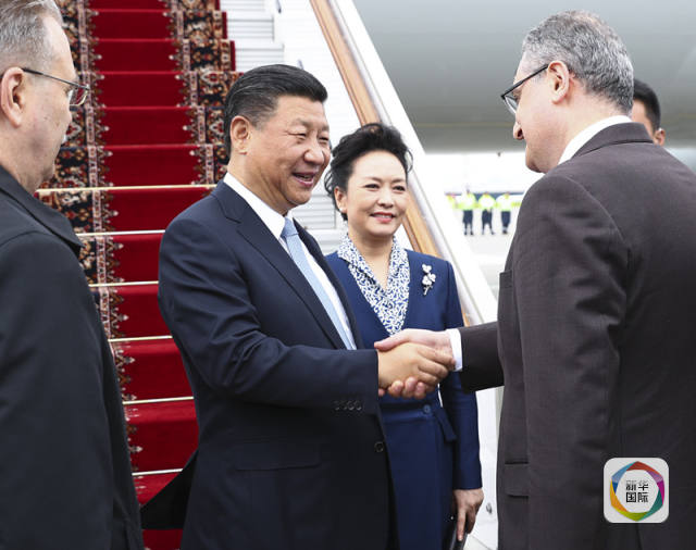 7月3日,國家主席習近平乘專機抵達莫斯科,開始對俄羅斯聯邦進行國事訪問。這是習近平和夫人彭麗媛受到俄羅斯政府高級官員熱情迎接。(新華社記者謝環馳攝)