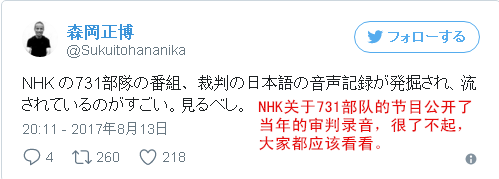 此次,NHK電視臺從俄羅斯獲得了原731部隊成員的認罪錄音。這些成員大都在1945年被蘇聯紅軍俘獲,并被關押到西伯利亞,在哈巴羅夫斯克法庭上接受了審判。