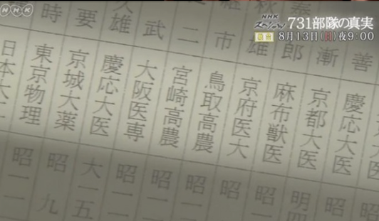 參加731部隊的機構及人員名單(圖片來源:NHK視頻截圖)