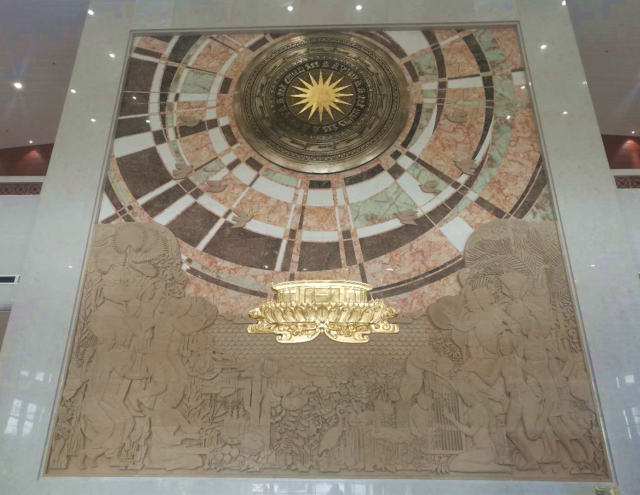 剛剛竣工的越中友誼宮,即將迎來一場盛大的落成移交儀式。記者抵達時,花匠們正在門口精心布置,用鮮花擺出中國和越南國旗的式樣。步入大廳,由中央美術學院歷時七個月設計的大型壁畫《山水相依 友誼長存》撲入眼簾——核心元素是中越古代共有的樂器“銅鼓”,寓意兩國文化交融源遠流長。畫面中下部是身著傳統(tǒng)服飾的中越民眾形象,或翩翩起舞,或引吭高歌,或手捧豐收果實,喜樂祥和中傳遞著中越之間濃厚的情誼。