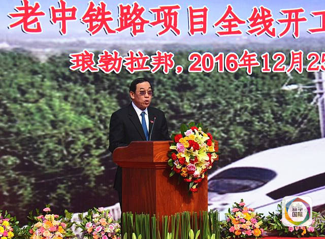 2016年12月25日,老中鐵路項(xiàng)目全線開(kāi)工儀式在老撾瑯勃拉邦舉行,老撾公共工程與運(yùn)輸部部長(zhǎng)奔占·辛塔馮在開(kāi)工儀式上致辭。(新華社發(fā))