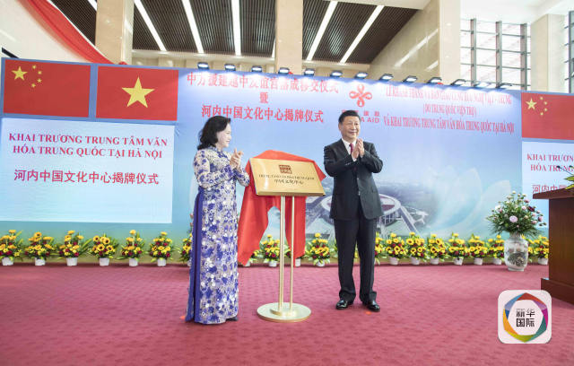 11月12日,中共中央總書記、國家主席習近平在河內(nèi)出席越中友誼宮落成移交儀式暨河內(nèi)中國文化中心揭牌儀式。這是習近平和越南國會主席阮氏金銀共同為中國文化中心揭牌。新華社記者李濤攝