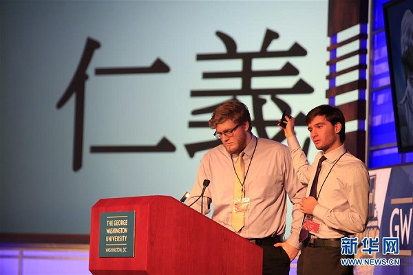11月18日,在美國首都華盛頓的喬治·華盛頓大學,參賽選手進行中文演講。美國喬治·華盛頓大學中國學生學者聯合會和喬治·華盛頓大學孔子學院聯合主辦的第一屆“華語擂臺”漢語辯論賽18日落下帷幕。來自賓夕法尼亞州、猶他州、佛羅里達州等美國多地的10名參賽者兩兩組隊,通過成語挑戰、現場問答和團隊辯論三種形式,展示了各自的漢語知識、語言和思辨能力及個人風采。新華社記者 楊承霖 攝