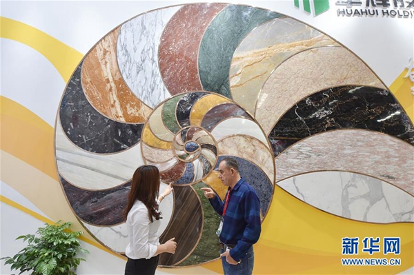 敘利亞客商默罕默德(右)在一家國內石材企業展位的“海螺狀”石材墻前(11月8日攝)。11月8日,第十八屆中國(南安)水頭國際石材博覽會在福建省南安市水頭鎮舉辦。 新華社記者 宋為偉 攝