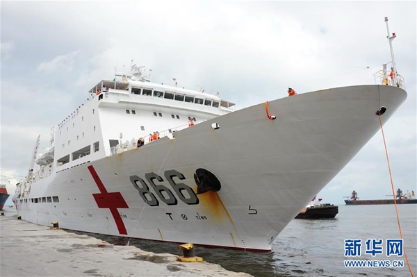 9月19日,中國海軍和平方舟醫院船停靠塞拉利昂弗里敦港。執行“和諧使命-2017”任務的中國海軍和平方舟醫院船19日在任務指揮員管柏林、政委金毅率領下抵達塞拉利昂弗里敦港,開始為期8天的友好訪問并提供人道主義醫療服務。這是中國海軍艦艇首次訪問塞拉利昂。新華社記者石松攝